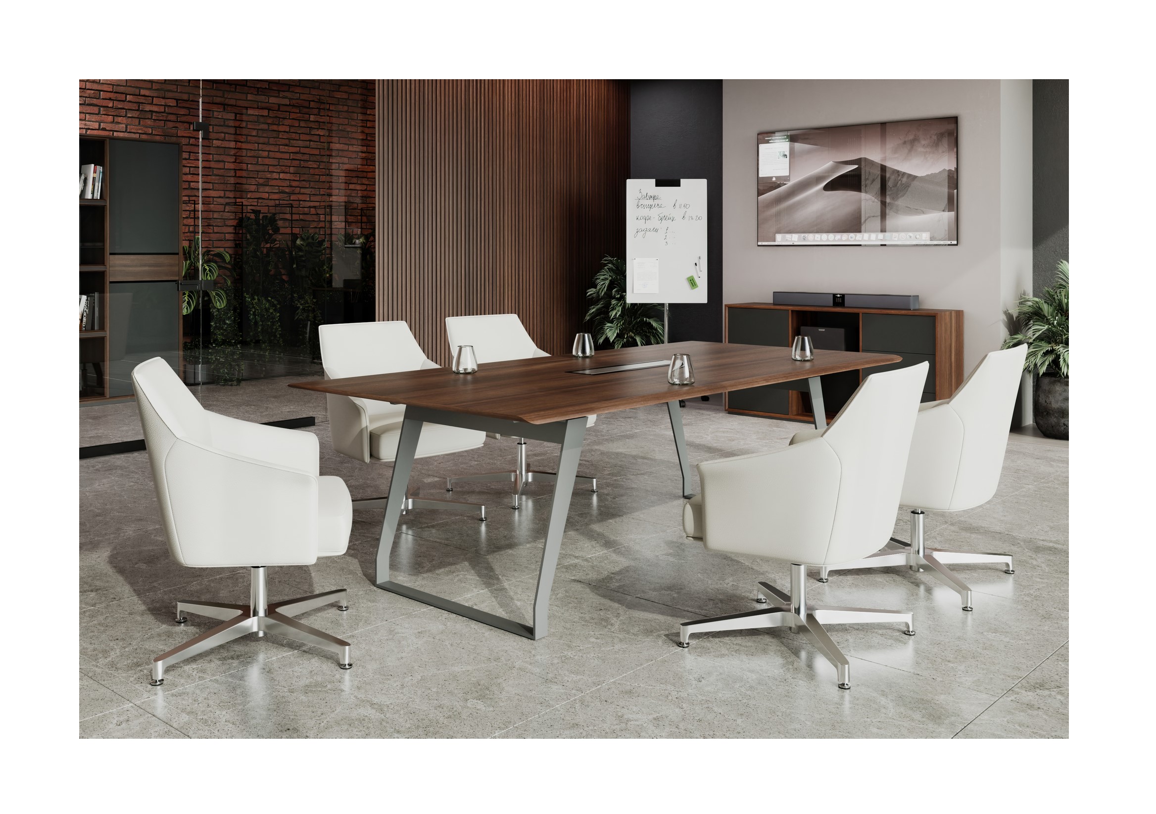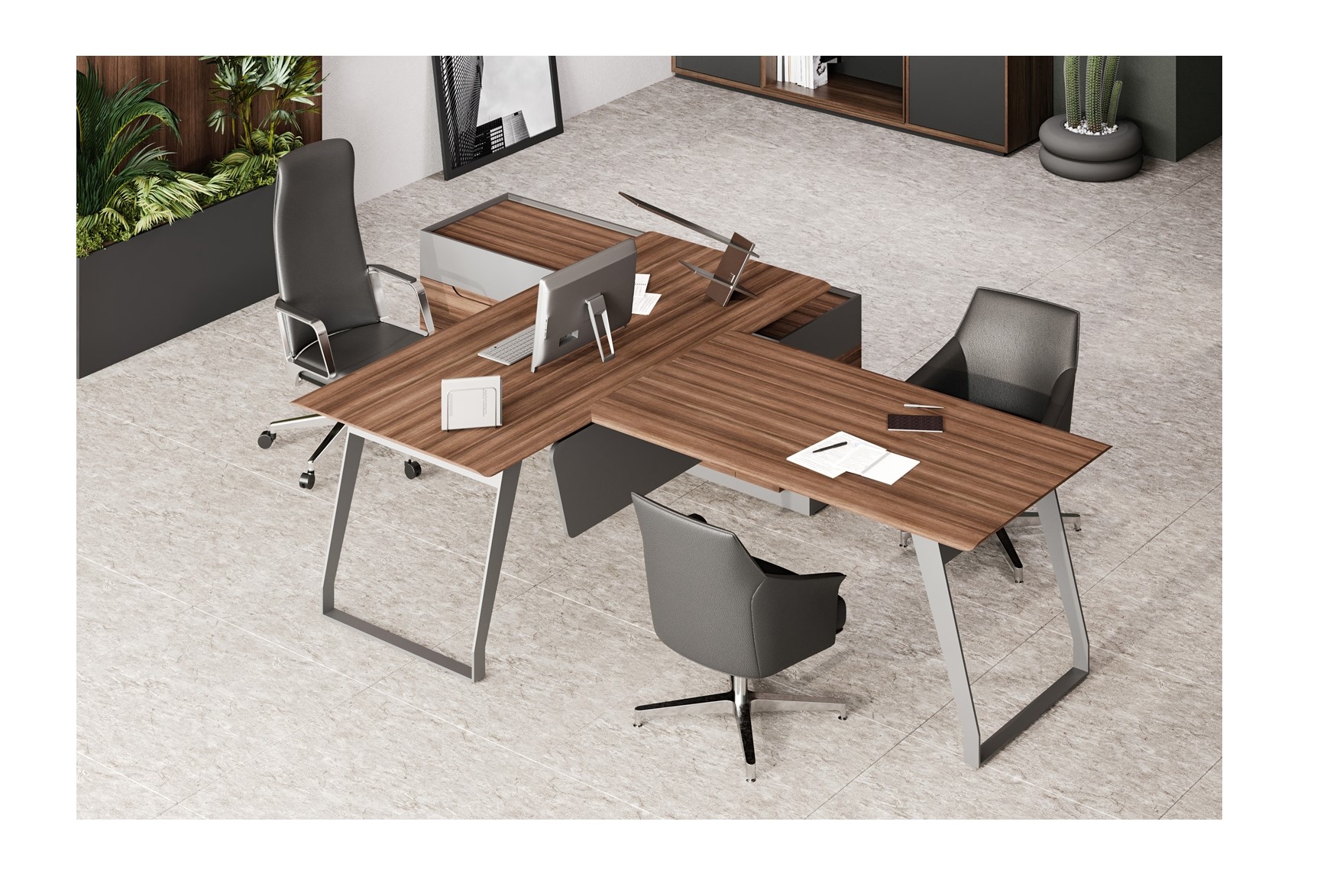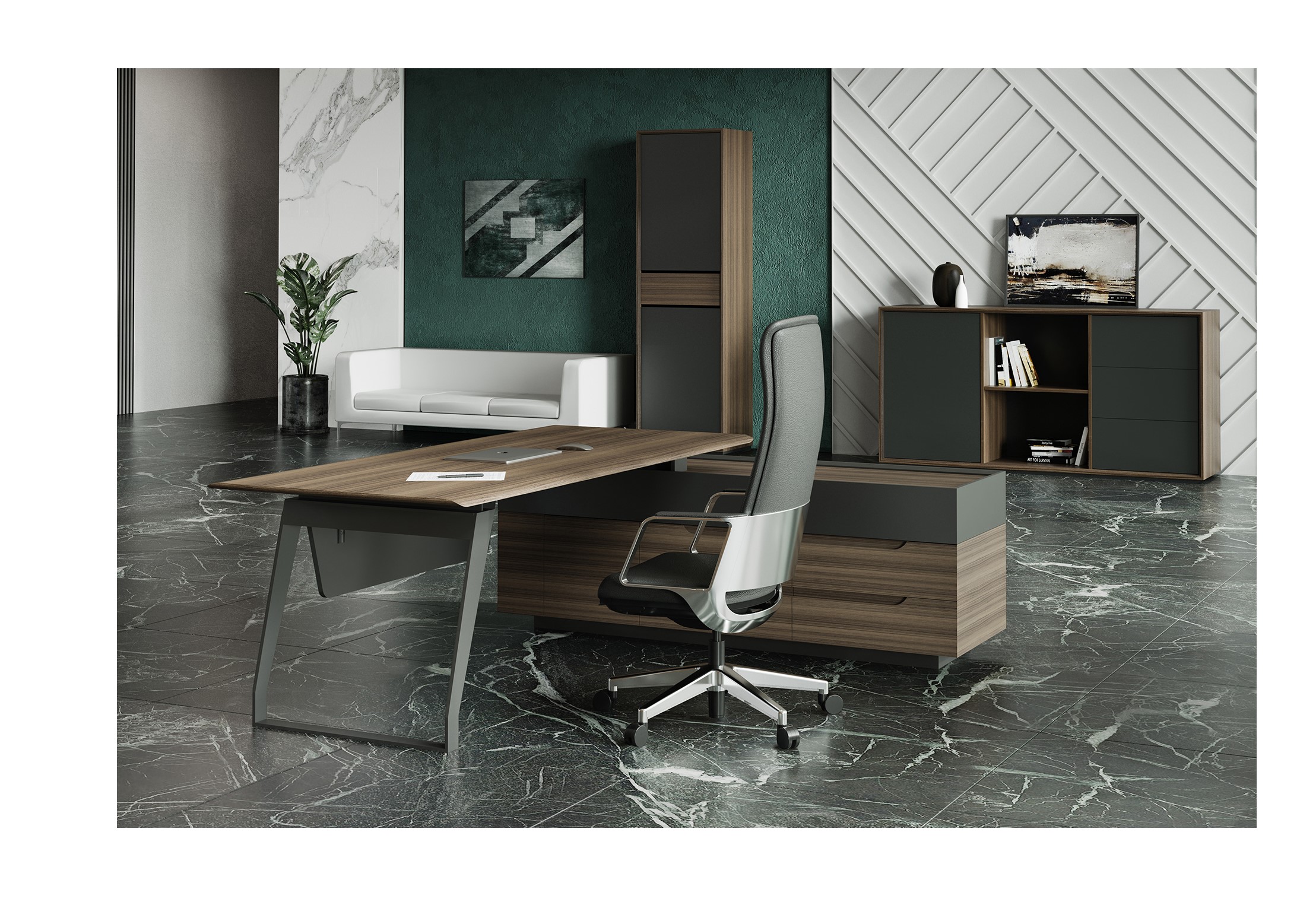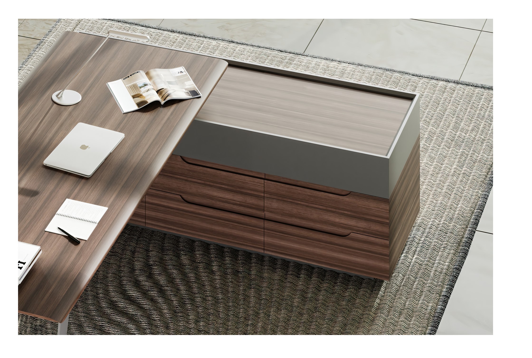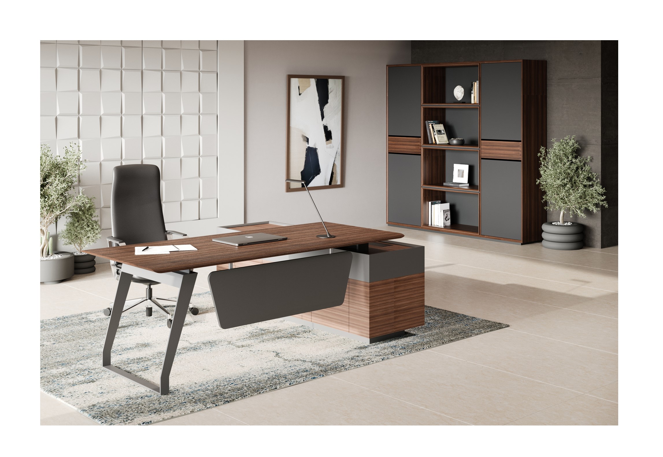 Кабинет QUARTZ — центр всех ключевых событий и часть имиджа его владельца. Он словно изящный «купаж», объединяющий сразу несколько стилей — минимализм и классика. Поверхности из натурального шпона «Орех Американский» и мультишпона «Орех Авиньон» в сочетании с металлическими опорами необычного сечения формируют уникальный облик кабинета руководителя.