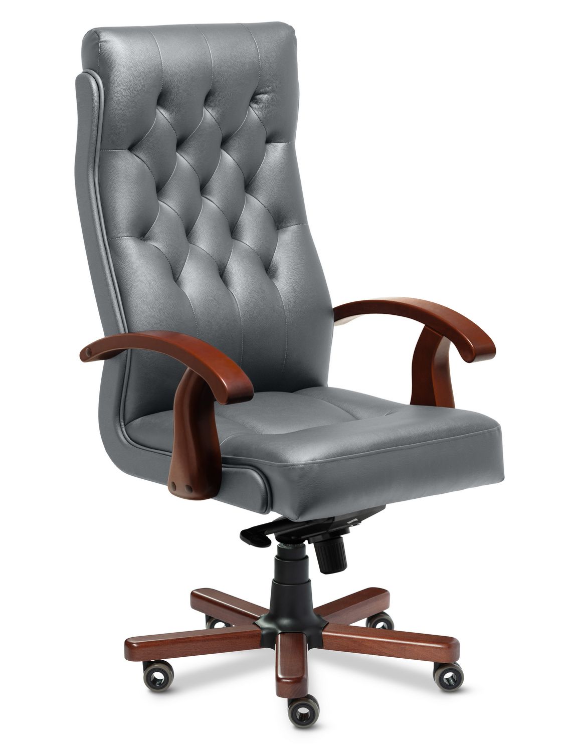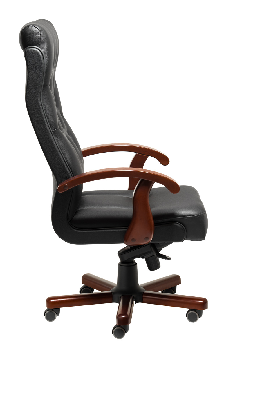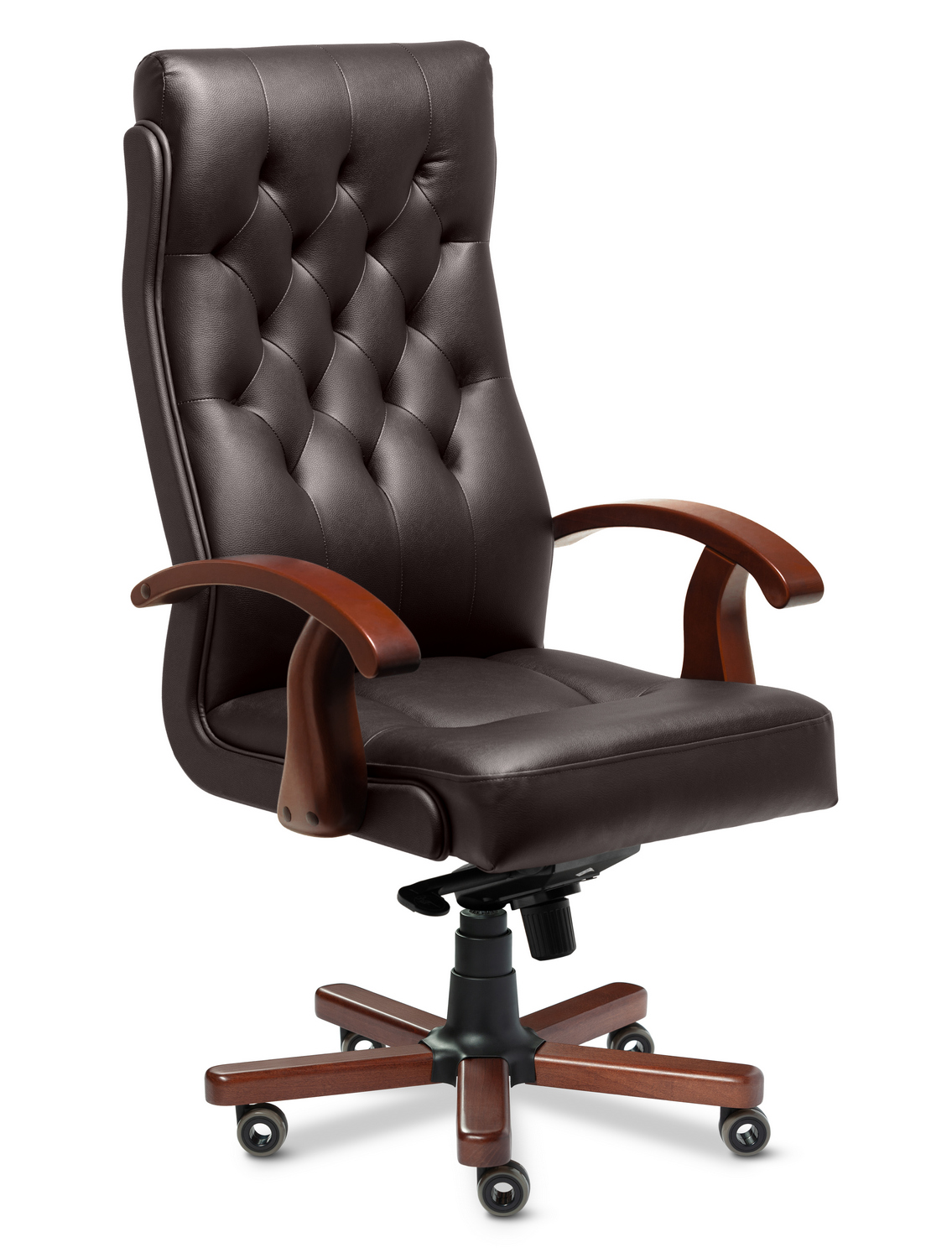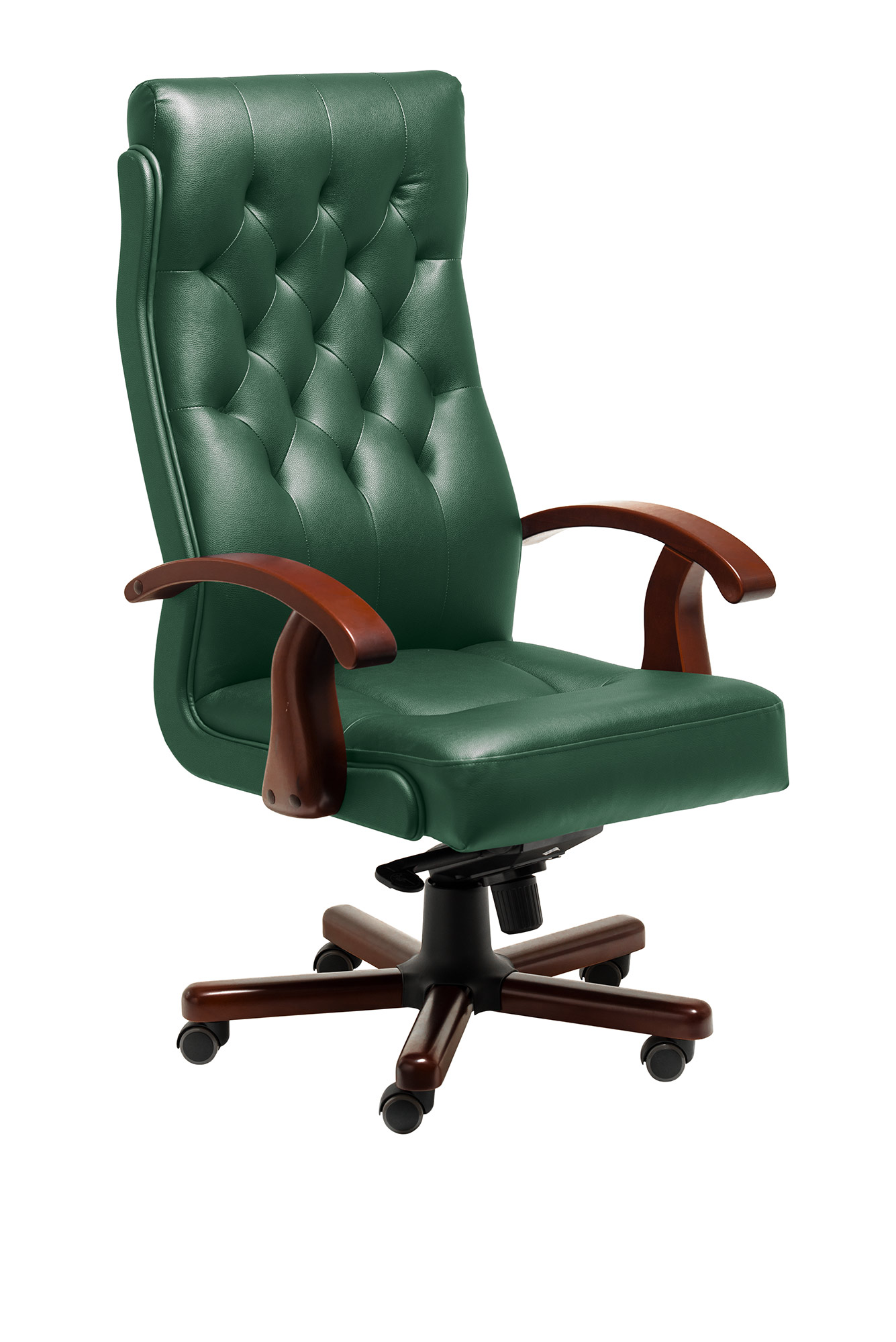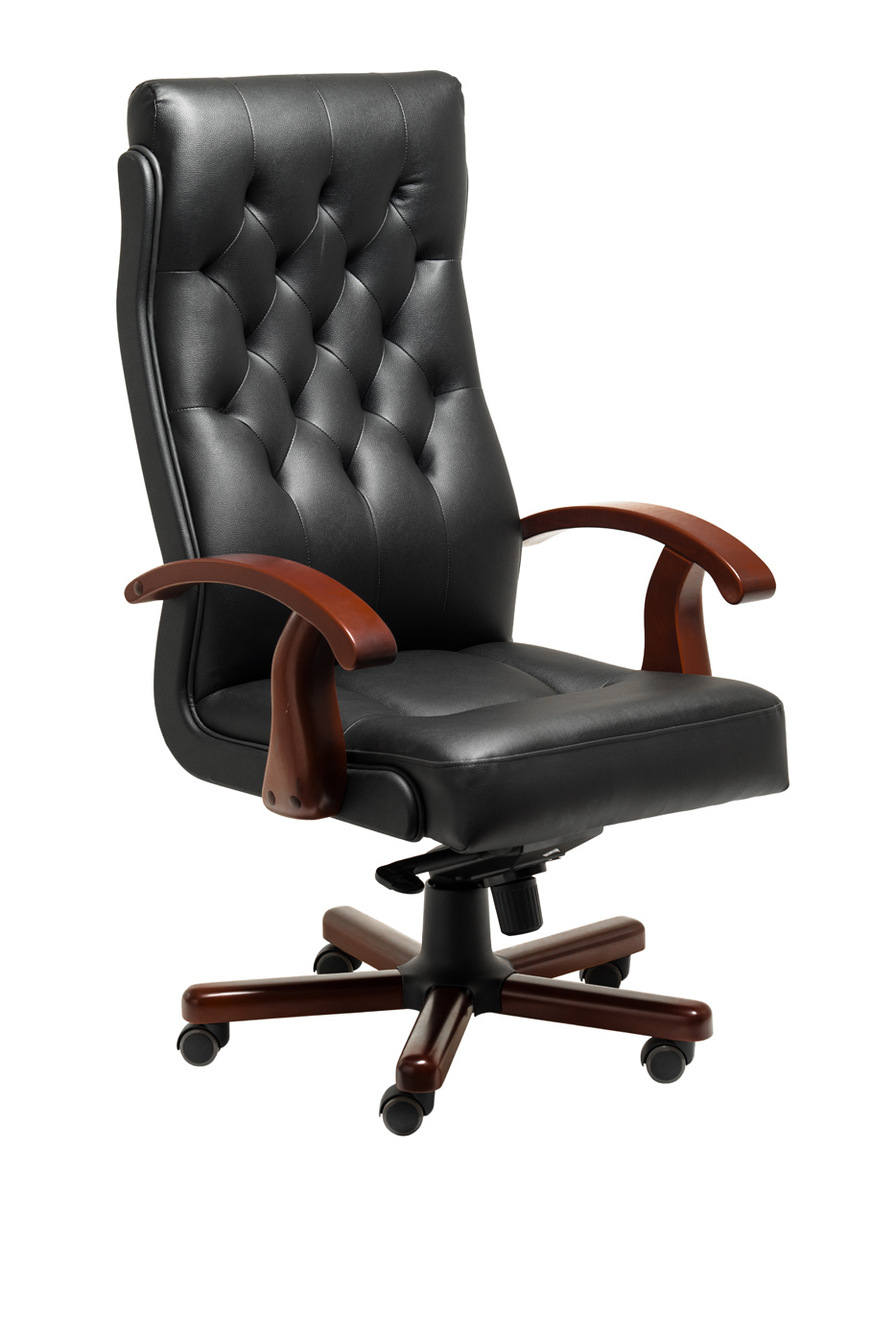 Офисное кресло для руководителя Darwin A выполнено из натуральной кожи и кожзама на задней части спинки. Подлокотники изготовлены из массива бука, основание – металлическое с накладками из дерева. Механизм наклона мультиблок позволяет фиксировать положение в четырёх точках, а также регулирует жесткость качания в зависимости от веса сидящего. Кресло оснащено прорезиненными колесами и газ-патроном третьей категории стабильности, который выдерживает нагрузку до 80 кг и 200 000 циклов.
