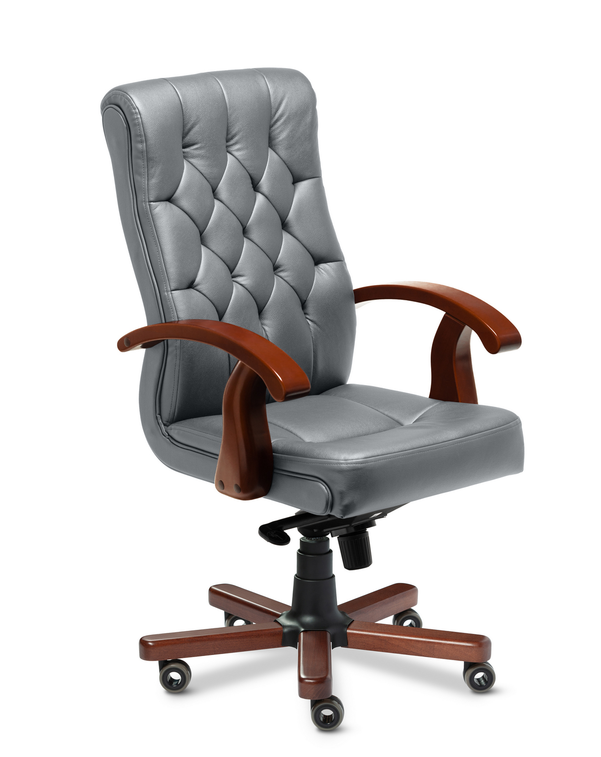 Офисное кресло для руководителя Darwin B выполнено из натуральной кожи с задней частью из кожзама. Подлокотники сделаны из массива бука, а основание — металлическое с деревянными накладками. Механизм наклона мультиблок позволяет фиксировать кресло в четырех положениях и регулирует жесткость качания в зависимости от веса пользователя. Кресло оснащено прорезиненными колесами и газ-патроном третьей категории, который выдерживает нагрузку в 200.000 циклов при динамической нагрузке до 80 кг. Минимальное срабатывающее давление составляет 21,5 кг, максимальное — около 150 кг.